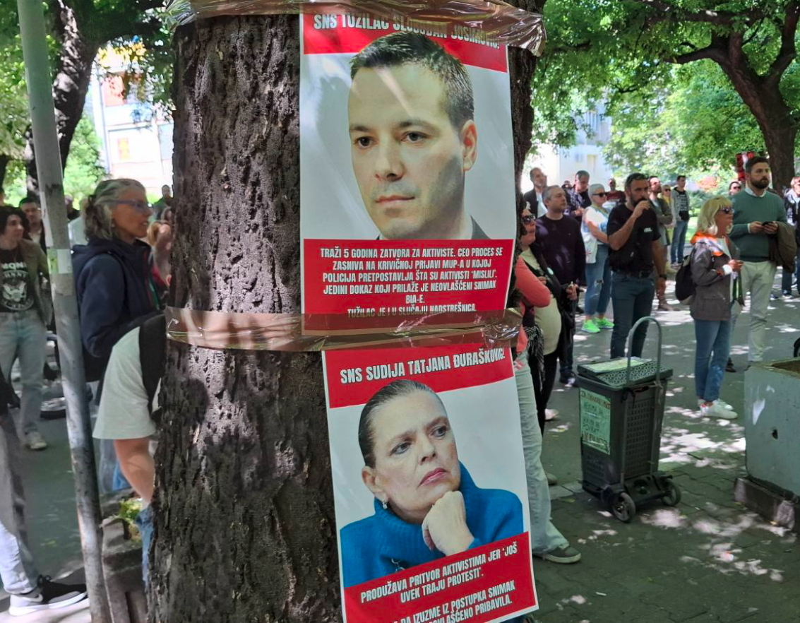 „SNS tužilac Slobdan Josimović. Traži pet godina zatvora za aktiviste. Ceo proces se zasniva na krivičnoj prijavi MUP-a u kojoj policija pretpostavlja šta su aktivisti ‘mislili’. Jedini dokaz koji prilaže je neovlašćeni snimak BIA. Josimović je tužilac i u slučaju ‘Nadstrešnica'“, navodi se na jednom od plakata.
