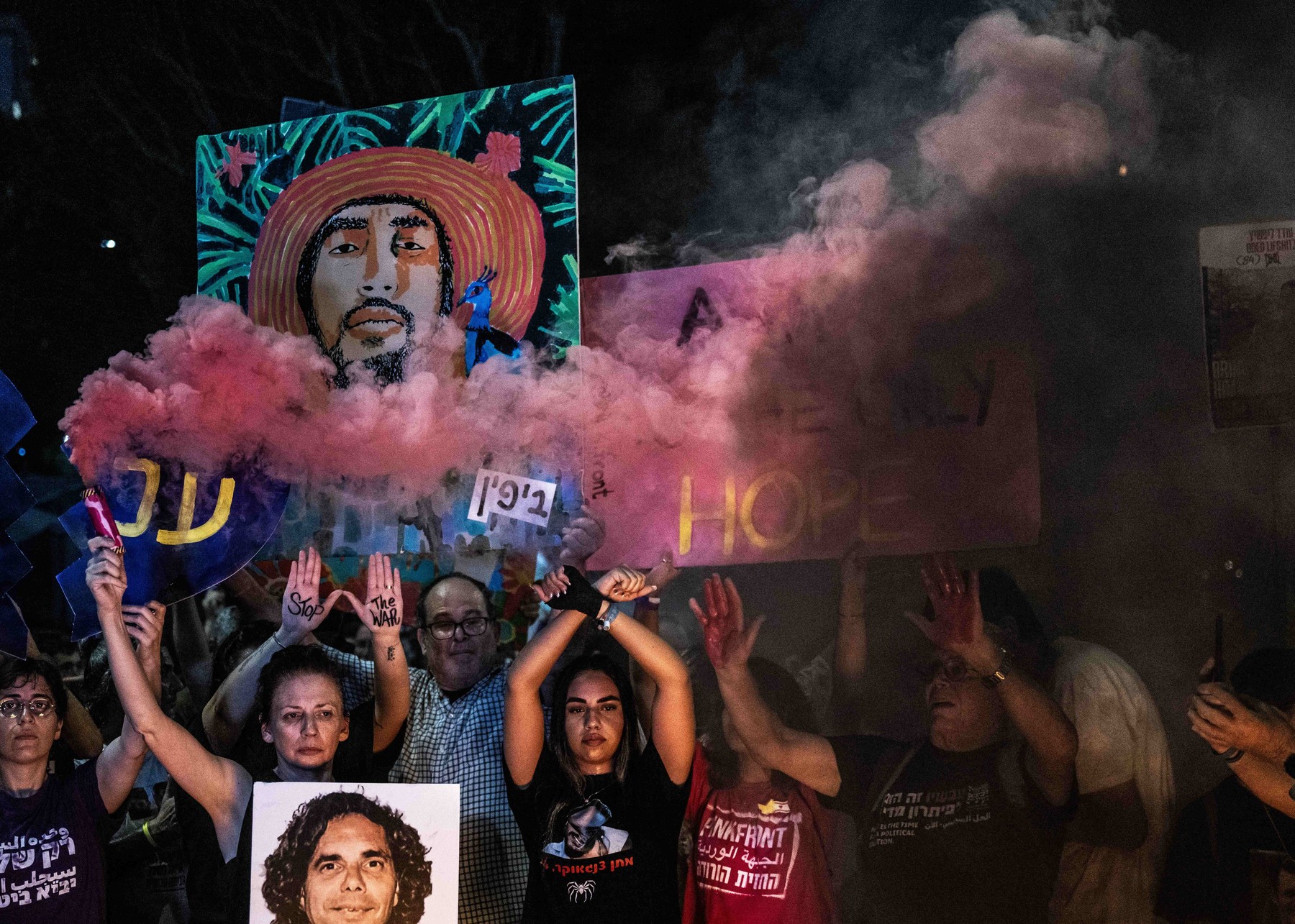 Pojedini demonstranti ističu svoj zahtev za hitnim sporazumom kroz provokativne prikaze, uključujući pojedinca maskiranog u Netanijahua, nagnutog nad drugom osobom koja predstavlja mrtvog i okrvavljenog taoca, pored transparenta na kojem piše „Dodao sam klauzule, taoci su umrli. Izvini“.