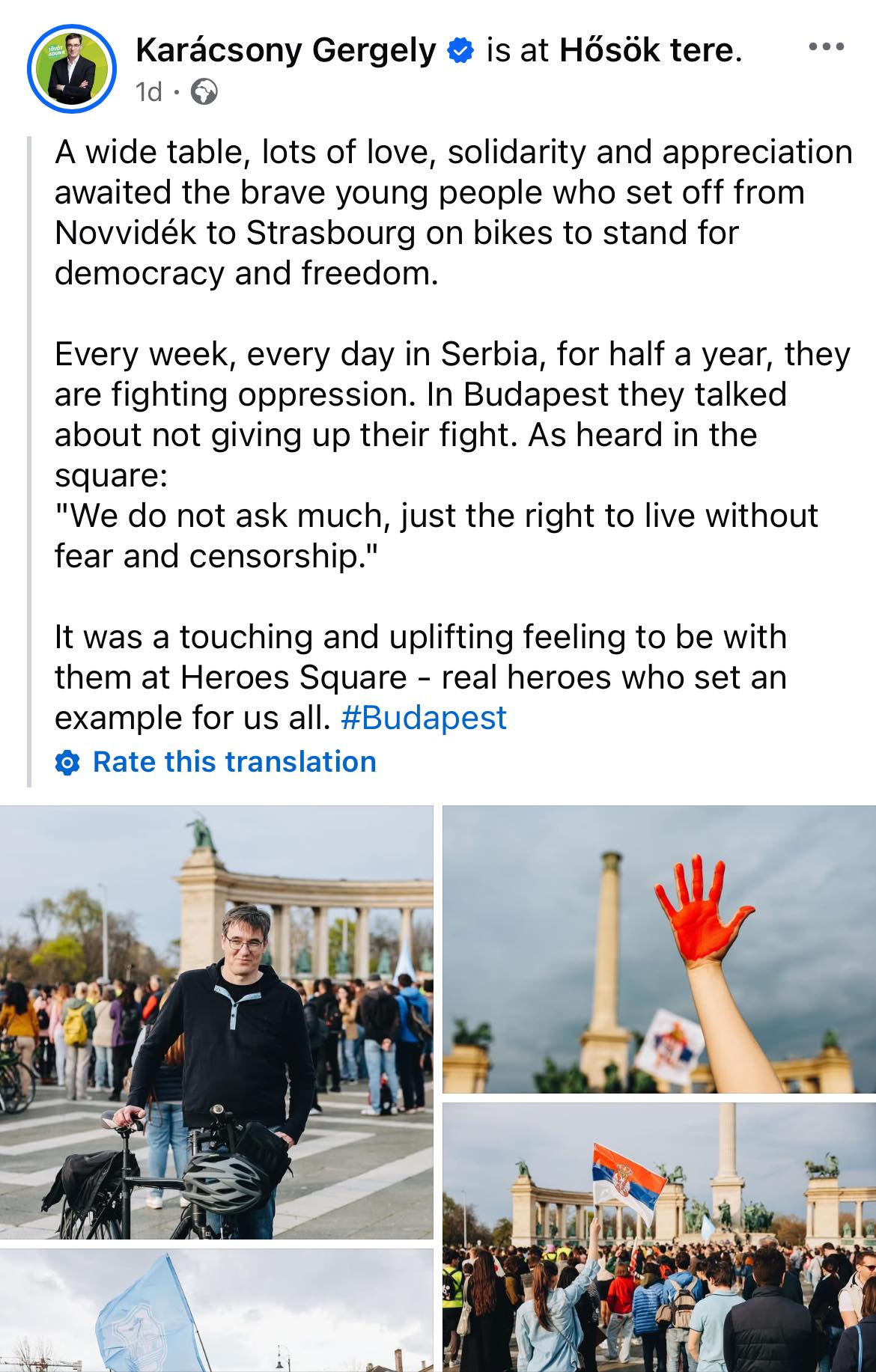 Gradonačelnik Budimpešte, Gergelj Karačon, napisao je na Fejsbuku da je bilo „dirljivo i uzvišeno“ biti sa studentima iz Srbije na Trgu heroja u Budimpešti.