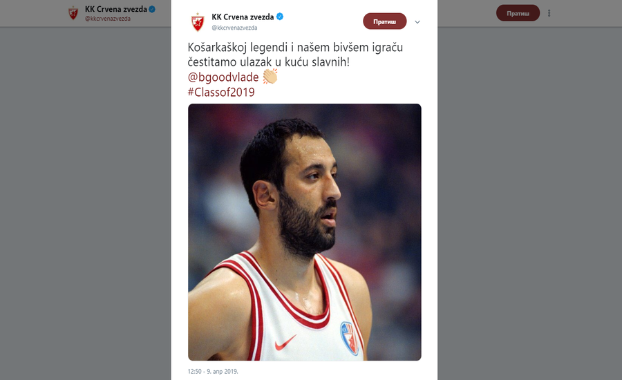 „Košarkaškoj legendi i našem bivšem igraču čestitamo ulazak u kuću slavnih“, stoji na zvaničnom Tviter nalogu KK Crvena zvezda.