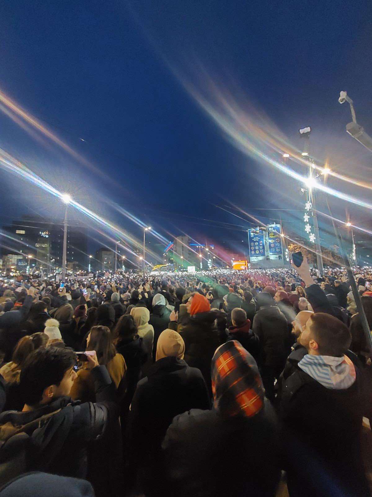 16:45: Završeno odavanje pošte stradalima, javlja naša reporterka Ana Mitić. Trg Slavija i svi prilazi sijaju svetlom nepregledne kolone protestanata. Ana piše da su u prvim redovima oko fontane na Slaviji uglavnom mladi ljudi i studenti, kao i da signal mobilne telefonije često ne radi.