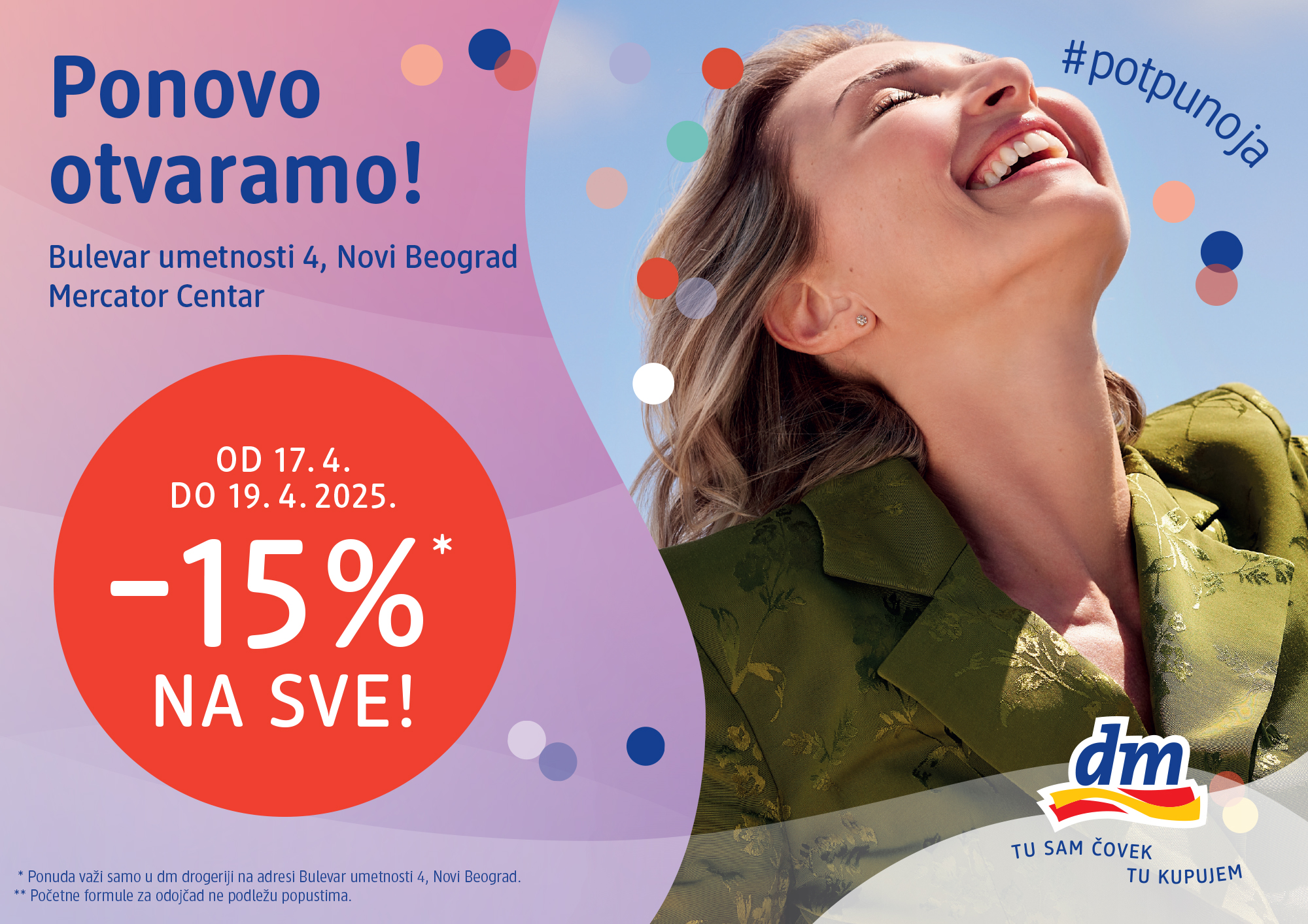 Ponovno otvaranje dm drogerije na adresi Bulevar umetnosti 4, zakazano je za 17. april 2025. U osveženom, modernom ambijentu, kupci mogu pronaći širok asortiman dm proizvoda za lepotu, negu, zdravlje, mame i bebe, domaćinstvo i još mnogo toga. Ovim povodom, dm je kupcima obezbedio 15% popusta na sve, i to u periodu od 17. do 19. 4. 2025. godine.
