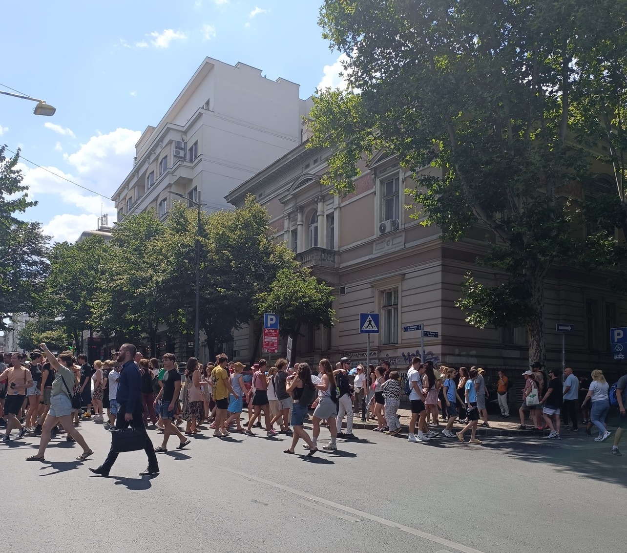 Kako se vidi na fotografijama koje je objavio, više desetina građana blokiralo je saobraćaj u Francuskoj ulici višestrukim prelaskom preko pešačkog prelaza, u krug, na uglu sa Siminom.