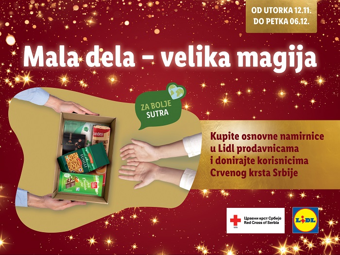Lidl Srbija i ove godine sprovodi tradicionalnu akciju solidarnosti u saradnji sa Crvenim krstom Srbije – od 12. novembra do 6. decembra pokreće ovogodišnju prazničnu kampanju Mala dela – velika magija. Tokom trajanja kampanje, potrošači imaju priliku da u svim Lidl prodavnicama kupe prehrambene artikle i proizvode za ličnu higijenu i doniraju ih iza kasa, direktno time pružajući pomoć najugroženijim sugrađanima, korisnicima usluga Crvenog krsta Srbije.