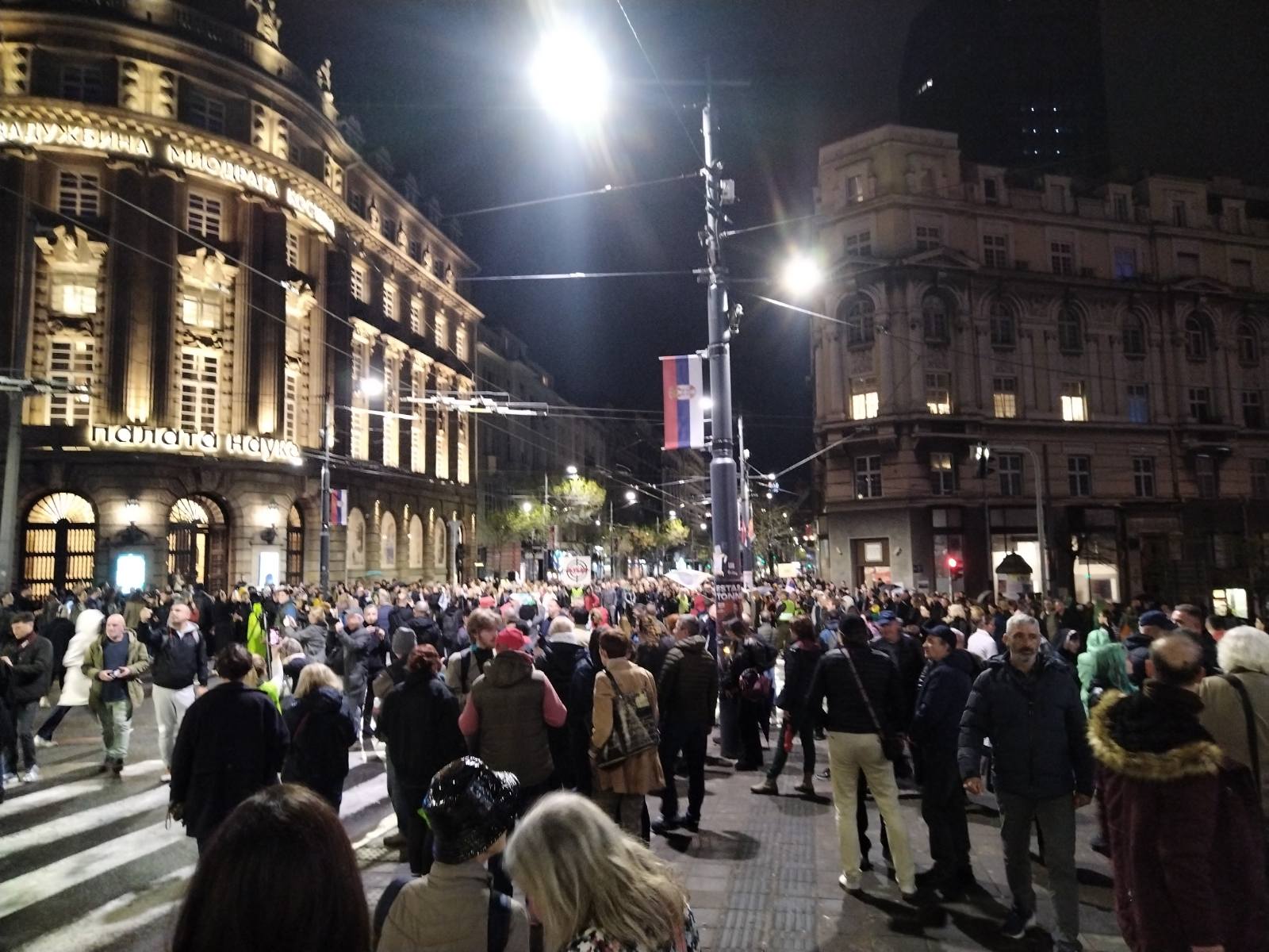 Skup na uglu ulica Kneza Miloša i Kralja Milana počeo je u 19 časova sedamnaestominutnom tišinom u sećanje na 16 žrtava nesreće na Železničkoj stanici Novi Sad i stradale u požaru u Severnoj Makedoniji.
