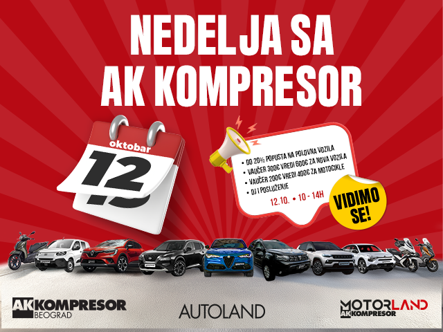 Od 12. oktobra, svi saloni Auto kuće Kompresor na Dorćolu radiće i nedeljom, u terminu od 10 do 14 časova. To znači da će ljubitelji automobila vikendom moći da obiđu ponudu brendova Renault, Dacia, Nissan, Citroën, Jeep, Alfa Romeo, Fiat, kao i Autoland, salon polovnih automobila i Motorland, salon motocikala i to bez žurbe i u pravoj nedeljnoj atmosferi.
