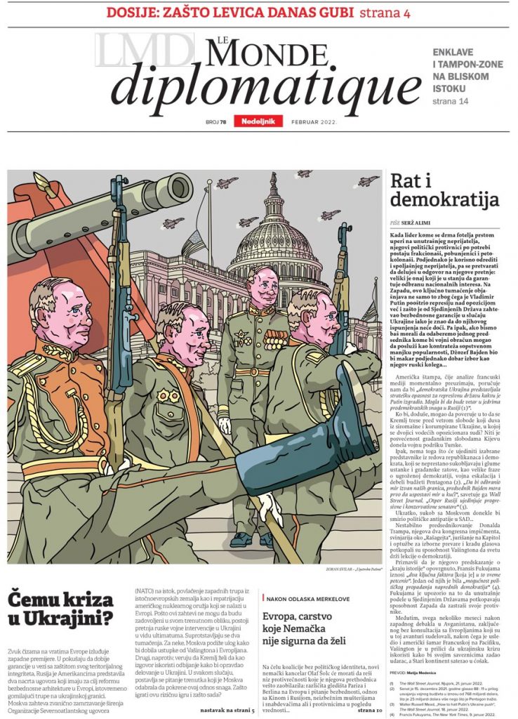 Možda ćemo morati da se naviknemo i na ovakve rečenice: u trenutku zaključenja ovog broja Nedeljnika, u utorak kasno uveče, još nije bio počeo rat. Da se malo (gorko i možda blago neukusno) našalimo, nadamo se da rat neće početi u sredu, jer ćemo jedne sedmice onda biti bajati. Crni humor na stranu, početkom ove sedmice jeste delovalo da će tenzije na granici Ukrajine i Rusije makar malo splasnuti, ali ovaj potencijalni sukob zavredio je, nažalost, veliki dosije u Nedeljniku, kao i pogled u Mond diplomatiku, redovnom dodatku Nedeljnika.