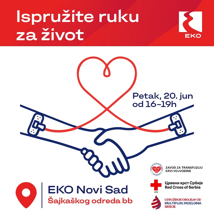 U okviru meseca dobrovoljnog davanja krvi, EKO Serbia, u saradnji sa Udruženjem obolelih od multiplog mijeloma Srbije, Crvenim krstom Novog Sada i Zavodom za transfuziju krvi Vojvodine, organizuje humanitarnu akciju pod nazivom „Ispruži ruku za život“. Cilj je podizanje svesti o značaju doniranja krvi i pružanje podrške onima kojima je najpotrebnija – jer nekome taj gest može značiti život.