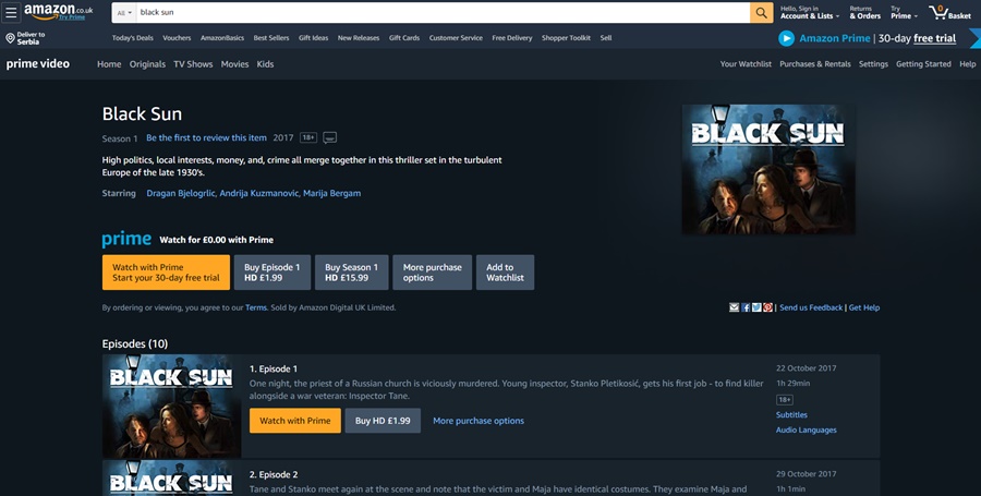 Na Amazonu je omogućeno gledanje prve sezone, odnosno deset epizoda „Senki nad Balkanom“. Serija Dragana Bjelogrlića na englskom nosi naslov „Black sun“, namenjen inostranom tržištu. Amazon prime, inače, prema poslednjem izveštaju iz januara 2020. godine, pokriva tržište od preko 150 miliona pretplatnika.