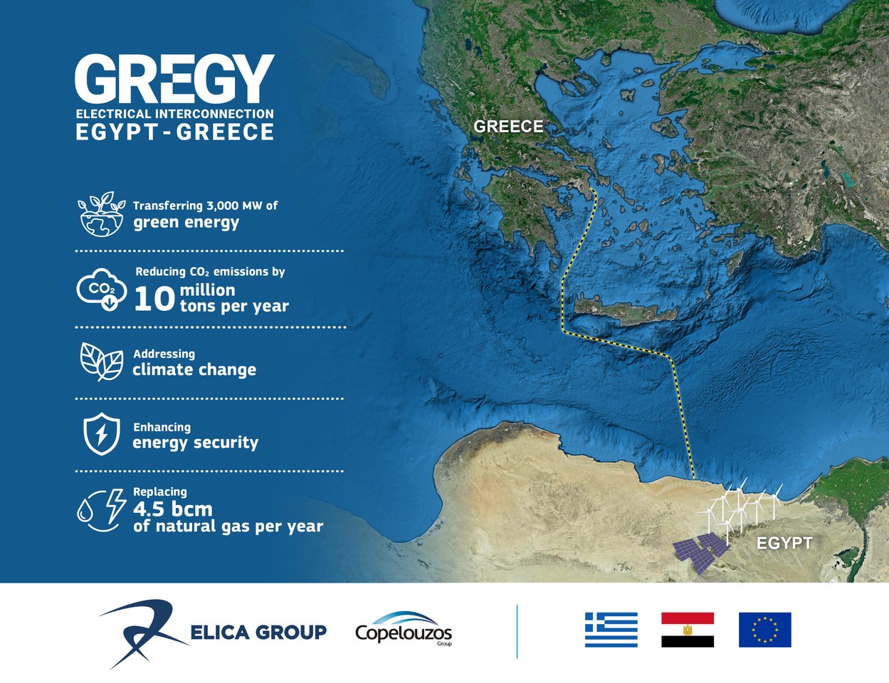 Ovaj vodeći projekat povezaće Egipat sa Evropom preko Grčke podmorskim kablom od 3.000 MW, koji je dugačak oko 950 km. Zelena energija sa konkurentnim cenama koju će kabl prenositi iz Egipta u Grčku proizvodiće se putem obnovljivih izvora energije od 9,5 GW koje će izgraditi i kojima će upravljati Copelouzos Group u Egiptu. Ovih 3.000 MW zelene energije koje će projekat GREGY prenositi zameniće 4,5 milijardi kubnih metara prirodnog gasa godišnje i smanjiti emisije CO2 za oko 10 miliona tona godišnje.