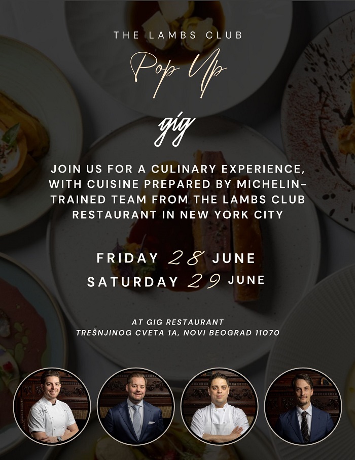 The Lambs Club, jedan od najprestižnijih restorana u New Yorku, poznat je po svojoj izuzetnoj kuhinji i inovativnom pristupu. Njihovi talentovani šefovi doneće esenciju svoje bogate ponude direktno u restoran GIG, kreirajući gastronomski spektakl koji će zadovoljiti i najistančanija nepca.