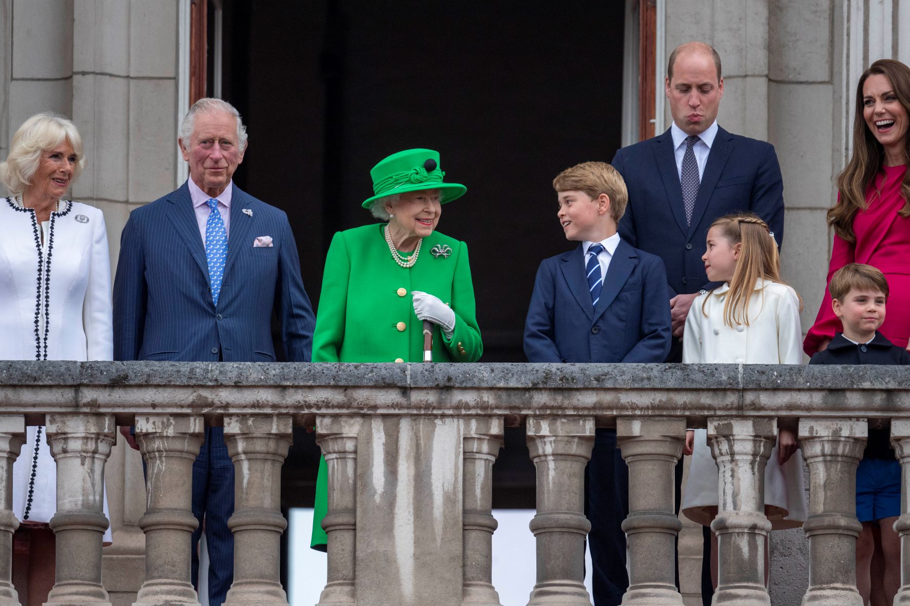 Kraljica (96) u zelenoj odeći, odsutna sa većine dogadjaja svog jubileja, izašla je na balkon u pratnji sina i unuka, pričeva Čarlsa i Vilijama i njihovih supruga sa decom, pre intoniranja himne „God Save the Queen“.