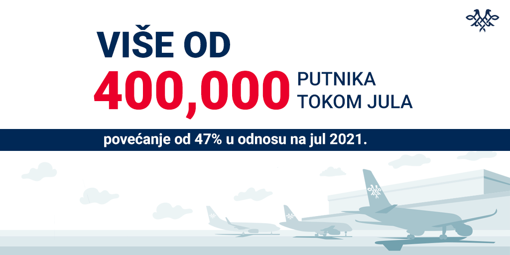 Er Srbija je tokom jula preko matičnog aerodroma u Beogradu, kao i vazdušnih luka u Nišu i Kraljevu prevezla više od 400 hiljada putnika u redovnom i čarter-saobraćaju. To predstavlja najveći broj prevezenih putnika za mesec dana još od oktobra 2013. godine, od kada kompanija posluje pod današnjim imenom. Broj prevezenih putnika u julu ove godine veći je za 47 odsto u odnosu na isti mesec 2021. godine, kada je srpska nacionalna avio-kompanija prevezla ukupno 276.101 putnika. Broj putnika takođe je za 9 odsto veći i u odnosu na do sada rekordnu poslednju pretpandemijsku 2019. godinu, kada je prevezeno 372.839 putnika.