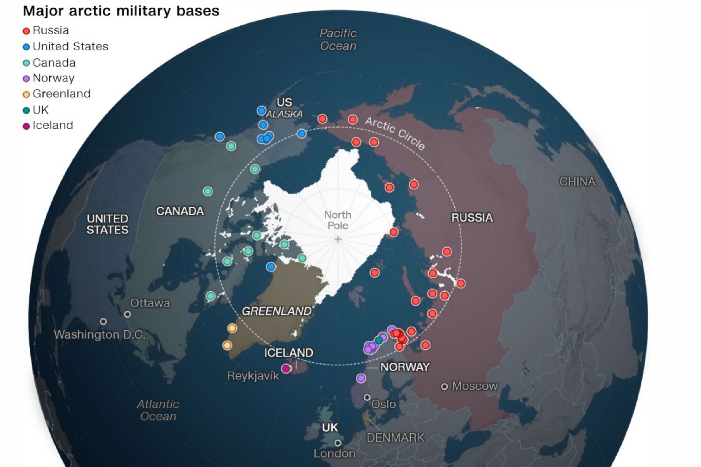 Postoji 66 vojnih lokacija i još stotine odbrambenih instalacija i ispostava unutar šireg arktičkog regiona, prema podacima Fondacije Simons, kanadske neprofitne organizacije koja prati arktičku bezbednost i nuklearno razoružanje.