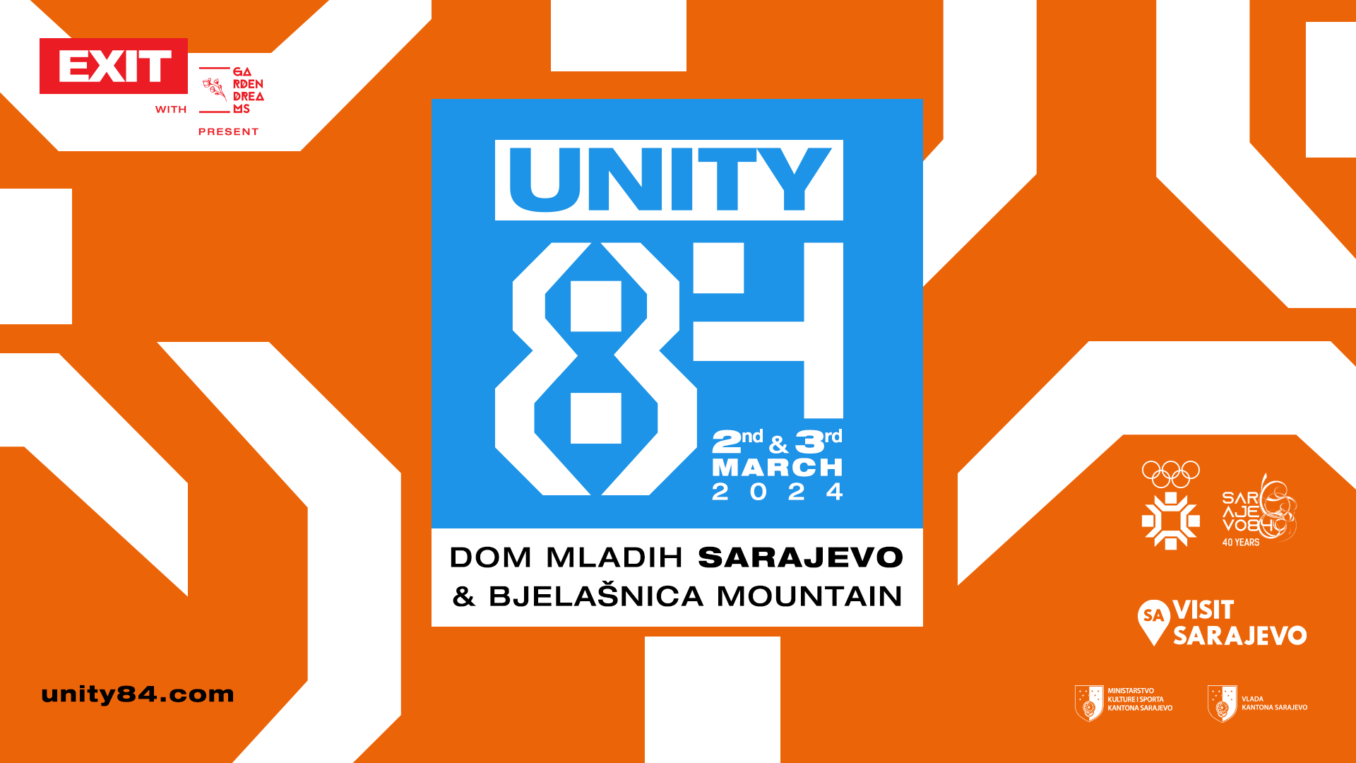 Pre tačno 40 godina, Sarajevo, a sa njim i ceo region, bilo je centar sportskog sveta. Te daleke 1984. godine u ovom gradu su održane Zimske Olimpijske igre. U čast ovog velikog jubileja, organizacija EXIT, zajedno sa sarajevskom organizacijom Garden of Dreams, sa zadovoljstvom predstavlja najnoviji dodatak svojoj festivalskoj porodici – Unity84 Festival! Postavljen 2. i 3. marta, festival će preko dana biti održan na olimpijskoj planini Bjelašnici, dok centralni događaj u subotu, 2. marta u Domu Mladih predvode svetske zvezde elektronske muzike Hot Since 82 i Lee Burridge. Kao jedan od simbola zajedništva nastupiće i vodeći sarajevski dvojac After Affair, vunderkind srpske i regionalne scene Lanna, kao i brojni DJ-evi iz Sarajeva, Banja Luke i Mostara.