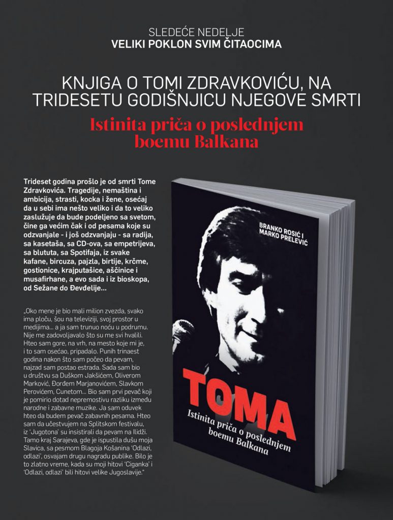 Kako se 30. septembra navršava 30 godina od kako je preminuo Toma Zdravković, Nedeljnik je pripremio veliki poklon svim čitaocima – knjigu „Toma – Istinita priča o poslednjem boemu Balkana“. Knjiga se dobija na poklon uz Nedeljnik koji izlazi sledećeg četvrtka, 30. septembra.