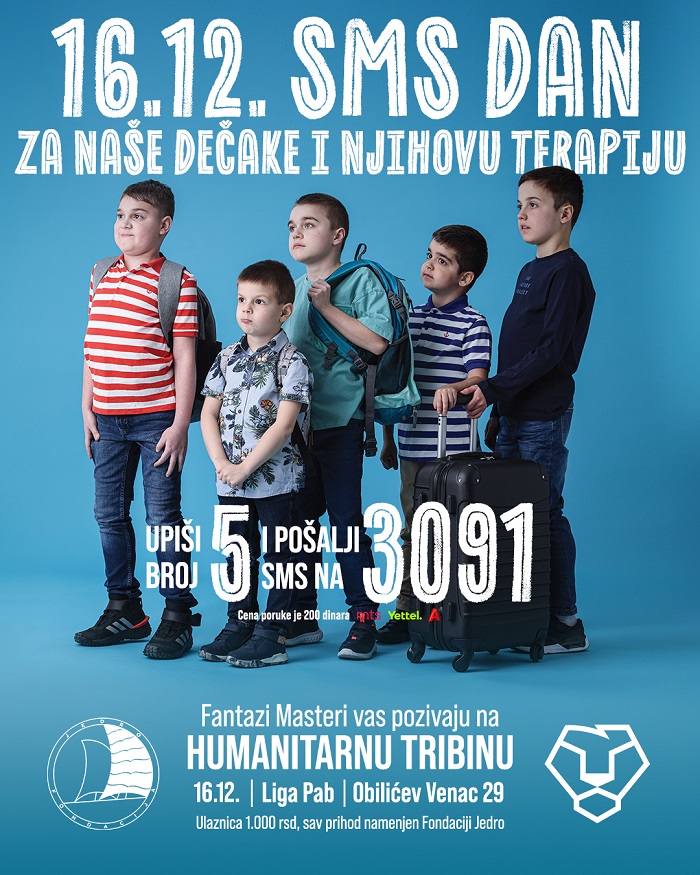 Fondacija „Jedro“ i sportsko udruženje Fantazi Masteri zajedničkim snagama pozivaju javnost na humanitarnu „Sportsku tribinu – 5 po 5“ koja će biti održana u ponedeljak, 16. decembra, sa početkom u 20h (okupljanje gostiju od 19h) u Liga Pubu (Obilićev venac broj 17).