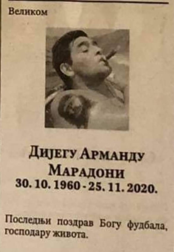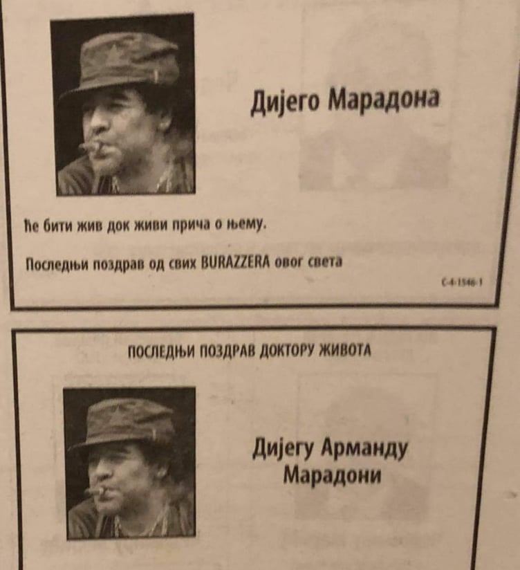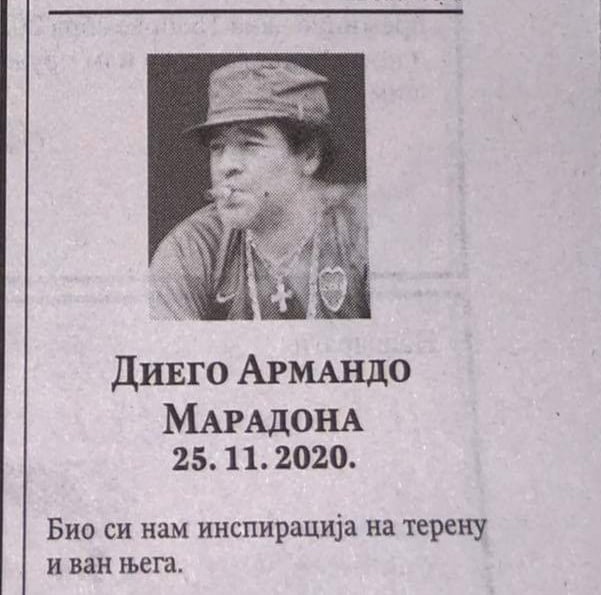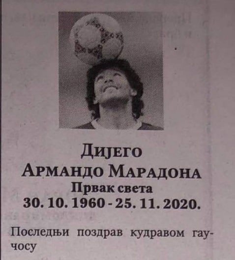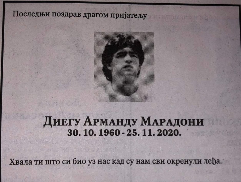 Dijego Armando Maradona je u tajnosti sahranjen dok su plakali Argentina, Napulj i svi gradovi sveta u kojima je bio voljen. Veliki broj obožavatelja njegovog lika i dela u Srbiji, posvetio mu je čitulje.