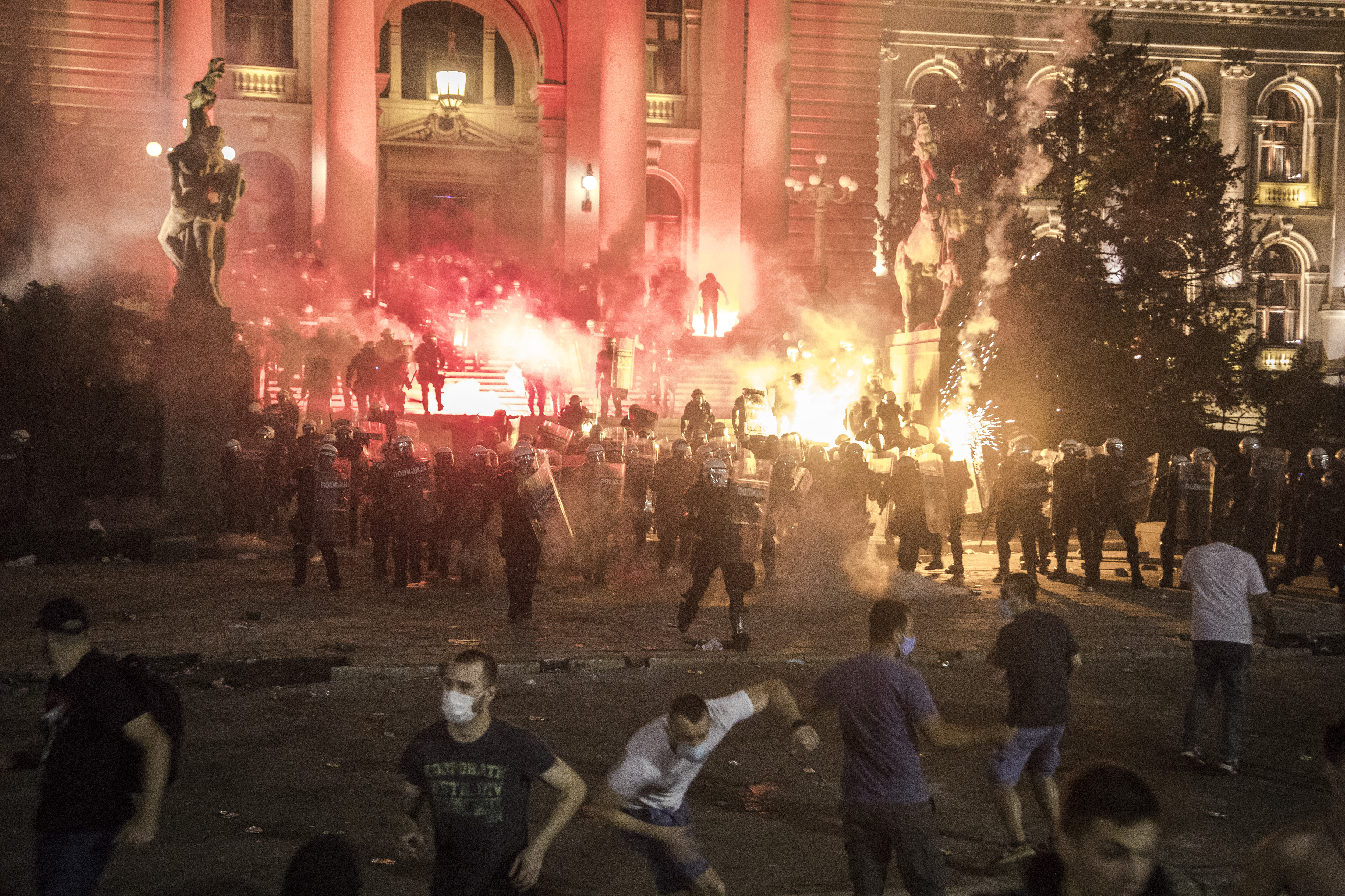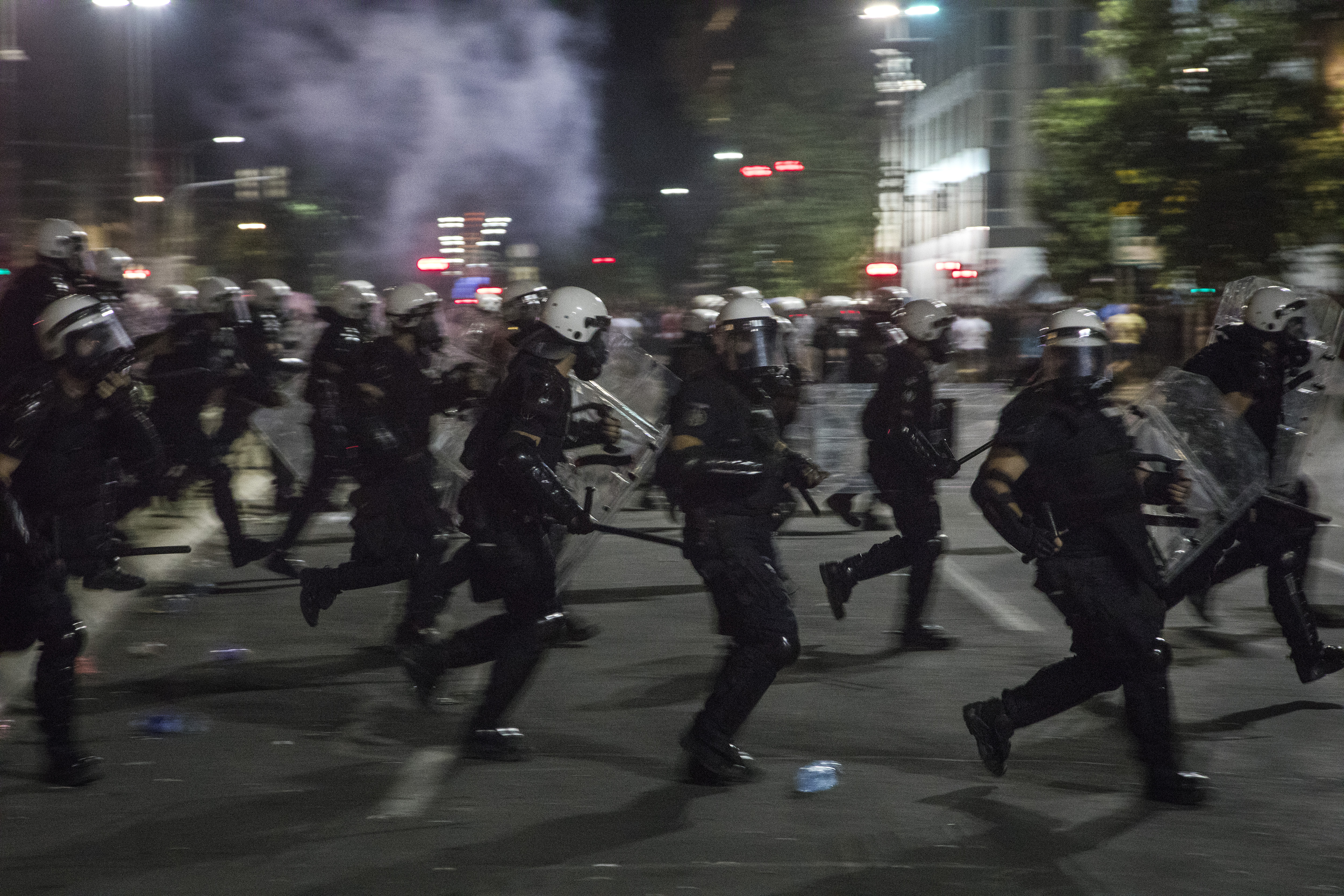Veče je počelo mirno, ali se tok protesta promenio kada su otpočeli sukobi dela demonstranata i policije. Ispaljivani su suzavci, letele kamenice prema prozorima i vratima Skupštine.
