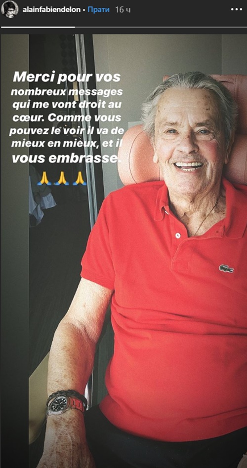 Ispod fotografije je poruka u kojoj Delonov sin zahvaljuje na porukama podrške i navodi da je Delonu sve bolje.