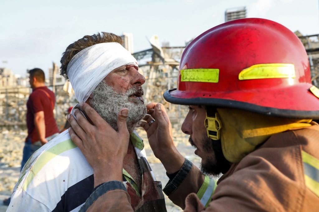 A wounded man is checked by a fireman near the scene of an explosion in Beirut on August 4, 2020. A large explosion rocked the Lebanese capital Beirut on August 4, an AFP correspondent said. The blast, which rattled entire buildings and broke glass, was felt in several parts of the city.,Image: 549832301, License: Rights-managed, Restrictions: , Model Release: no, Credit line: Anwar AMRO / AFP / Profimedia