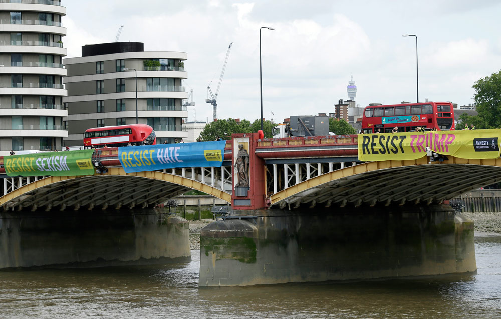 Na početku posete američkog predsednika Donalda Trampa Londonu, demonstranti su ispred američke ambasade razvili 20 metara dugu zastavu čime, kako kažu, žele da se odupru Trampovom „gaženju ljudskih prava“, objavili su britanski mediji.