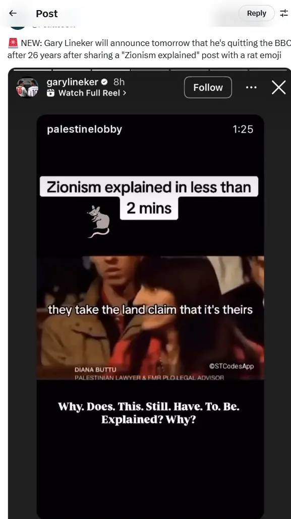 Razlog za ovu situaciju je post o ratu u Gazi, koji je na instagram storiju podelio Lineker uz natpis: