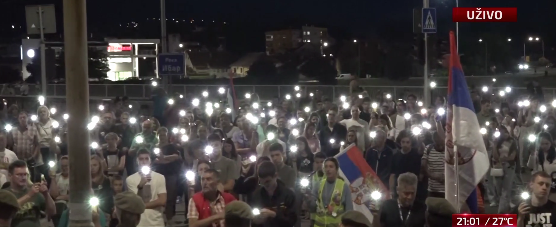 19.20.- Agencija Beta prenosi atmosferu sa Brankovog mosta. Oni kažu da su redari su upozorili okupljene da ne skandiraju, ne skaču i ne marširaju dok su na mostu zbog bezbednosti.