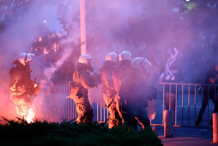 Vlasti su navele da su demonstranti gadjali signalnim raketama policiju koja ih je sprečila da dodju do oblasti gde je premijer Kirijakos Micotakis držao godišnji govor o ekonomiji, navodi Rojters.