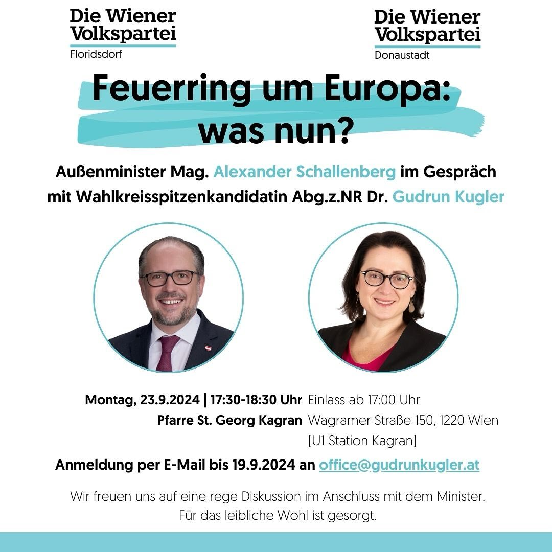 Gudrun Kugler (ÖVP), predsednica poslaničke grupe prijateljstva Austrija – Srbija u Saveznom parlamentu Republike Austrije poziva sve Srpkinje i Srbe u Beču na diskusiju u kojoj će učestvovati i Aleksandar Šalenberg (Alexander Schallenberg), ministar evropskih i spoljnih poslova Austrije, na temu “Vatreni prsten oko Evrope – šta sad?.