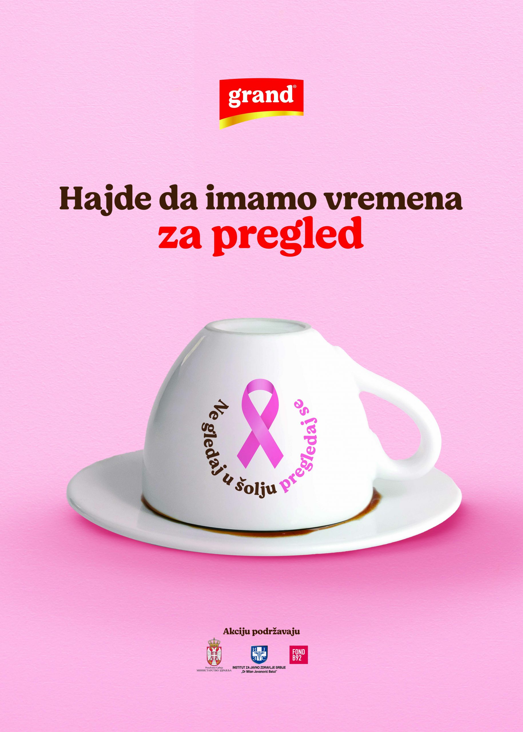 Grand kafa poručuje „Ne gledaj u šolju, pregledaj se!“ i još jednom poziva sve dame da pronađu vreme za ono što je najvažnije; da zakažu besplatan preventivni pregled i sačuvaju sebe i svoje zdravlje.