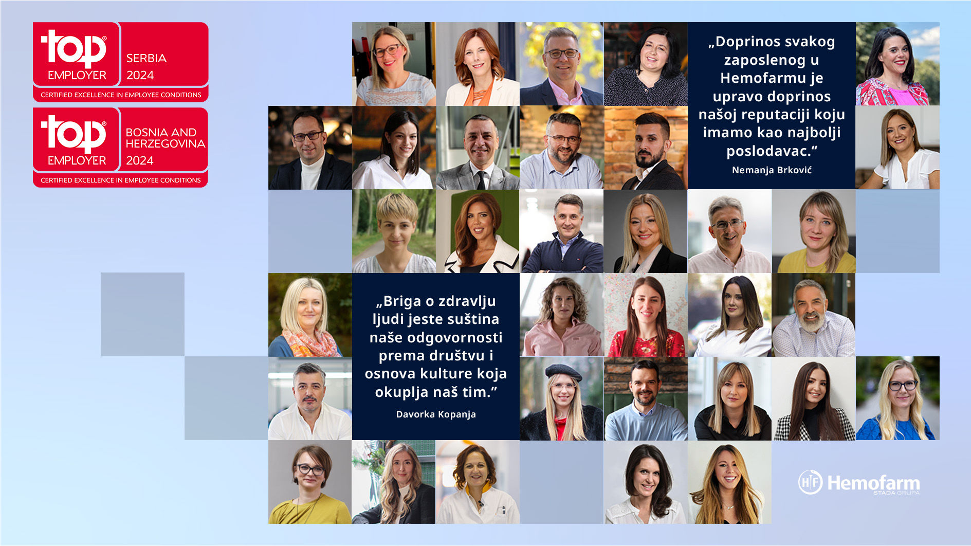 Treću godinu zaredom Hemofarm je proglašen Najboljim poslodavcem (Top Employer) u Srbiji i Bosni i Hercegovini od strane „Top Employers Institute“, nezavisne organizacije koja globalno ocenjuje kompanije u pogledu njihove posvećenosti ljudskim resursima. U isto vreme, status STADA grupe kao poželjnog mesta za rad potvrđen je proglašenjem za najboljeg poslodavca u Evropi za 2024. godinu.