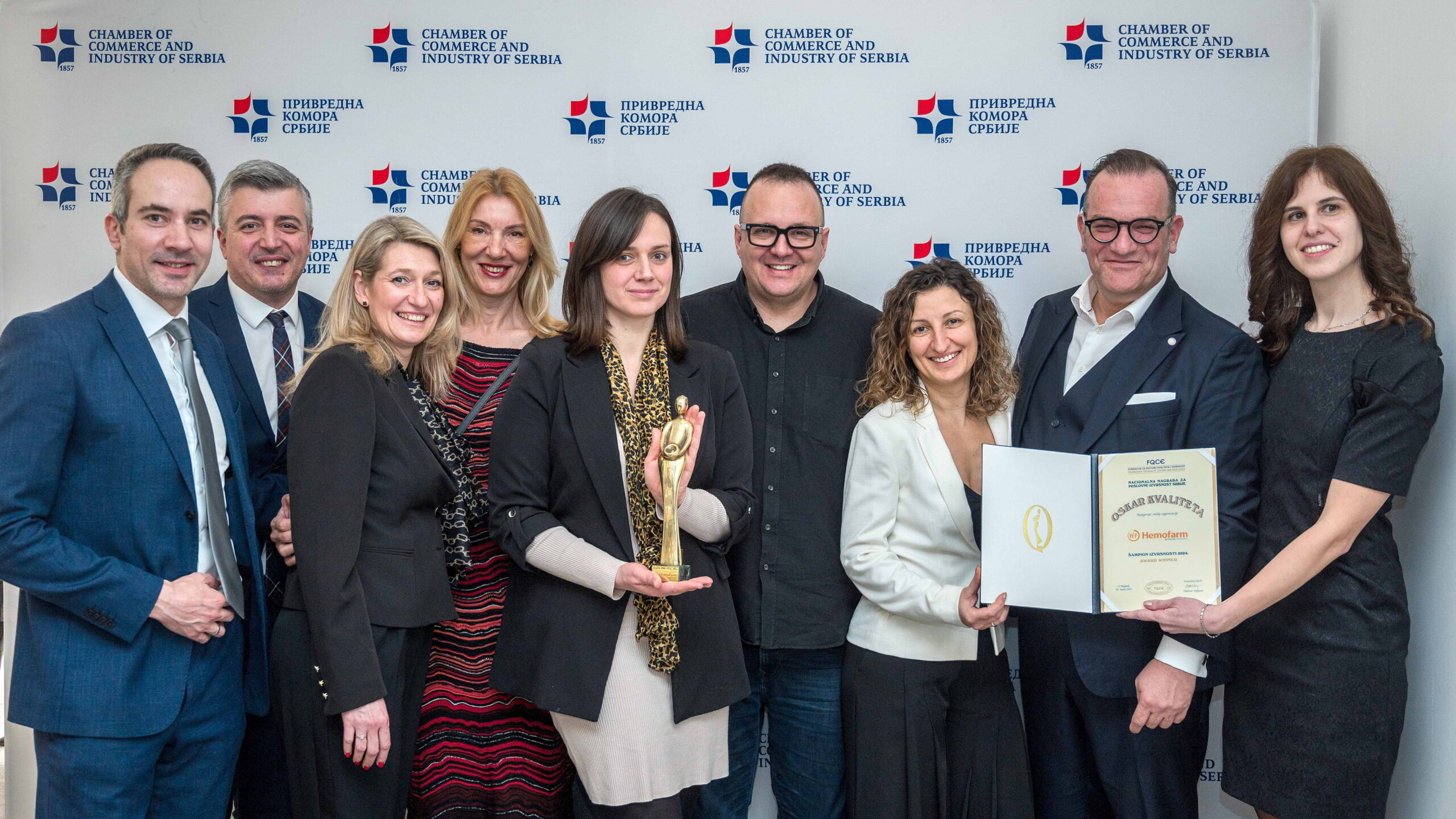 Kompanija Hemofarm osvojila je „Oskar kvaliteta”, nacionalnu nagradu za poslovnu izvrsnost koju dodeljuje Fond za kulturu kvaliteta i izvrsnost u saradnji sa Privrednom komorom Srbije i Ministarstvom privrede. Hemofarm je prestižnu nagradu godinu dobio za proizvodne lokacije u Vršcu, Šapcu i Dubovcu, osvojivši pritom najveći broj poena od kako je takmičenje uspostavljeno. Nagrada je predstavnicima Hemofarma uručena na svečanom događaju u Privrednoj komori Srbije.