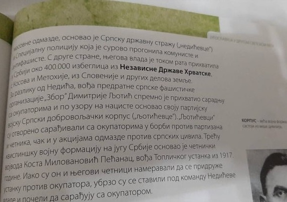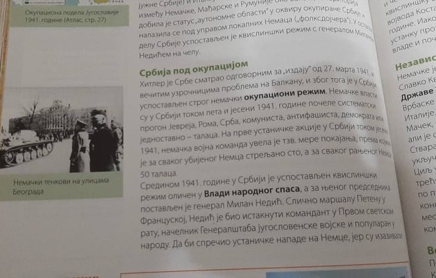 „Sredinom 1941. godine u Srbiji je uspostavljen kvislinški režim oličen u Vladi narodnog spasa, a za njenog predsednika postavljen je Milan Nedić. Slično maršalu Petenu u Francuskoj, Nedić je bio istaknuti komandant u Prvom svetskom ratu, načelnik generalštaba jugoslovenske vojske i popularan u narodu. Da bi sprečio ustaničke napade na Nemce, jer su izazivali masovne odmazde, osnovao je Srpsku državnu stražu („nedićevce“) i Specijalnu policiju koja je surovo progonila komuniste i antifašiste. Sa druge strane njegova vlada je prihvatila u Srbiji oko 400.000 izbeglica iz Nezavisne Države Hrvatske i sa Kosova i Metohije, iz Slovenije i iz drugih delova zemlje…“, piše u udžbeniku.