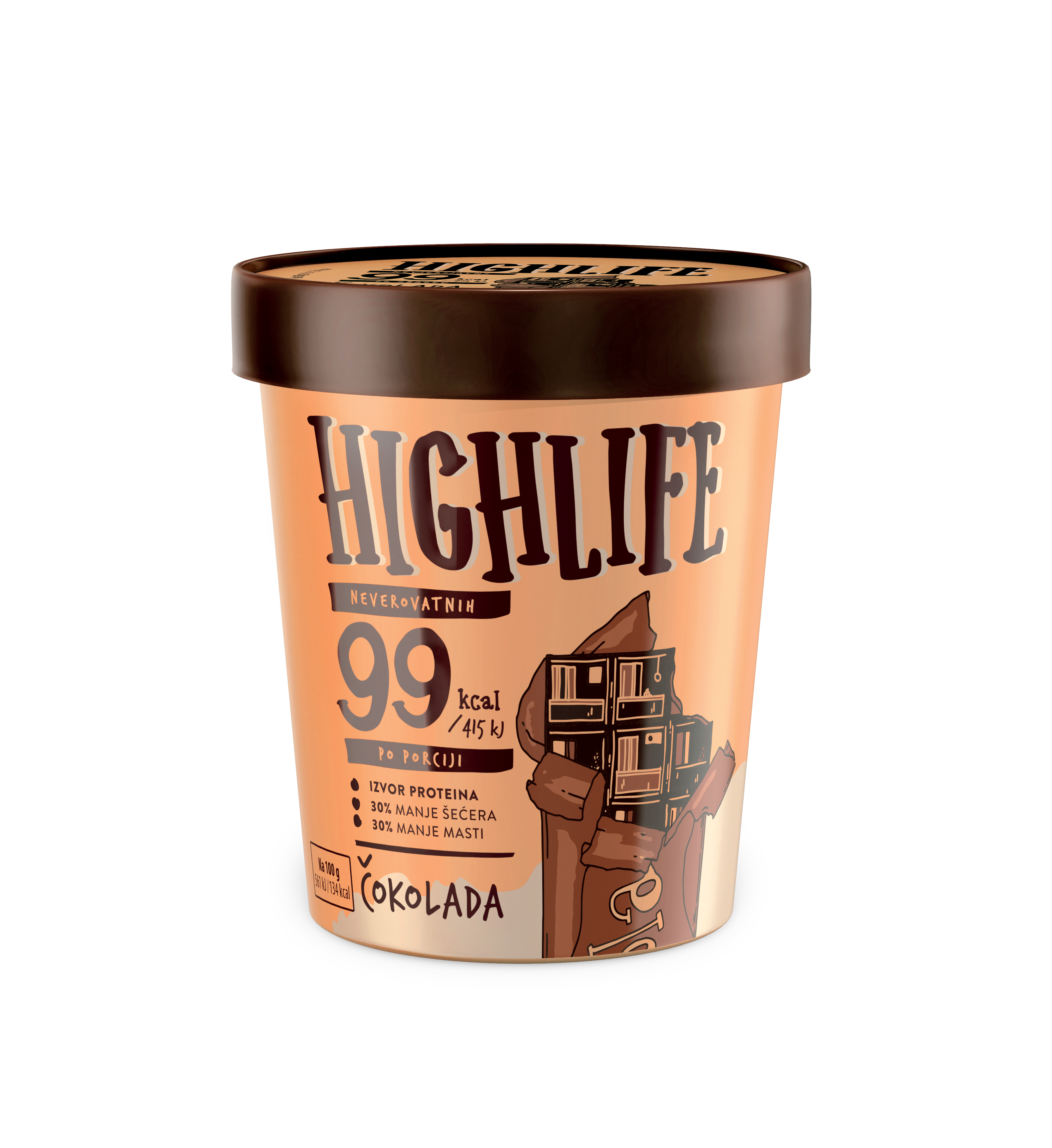 Highlife sladoled, desert namenjen svima koji su u potrazi za zdravijom verzijom omiljene ledene poslastice u sebi sadrži manje kalorija, više proteina i do 30 posto manje šećera i masti i dolazi u dva neodoljiva ukusa – čokolada i brownie čokolada s komadićima maline i prelivom od maline. Bogat kremastom teksturom i raznovrsnim ukusima, ovaj desert savršen je izbor za vas i vaše najbliže i jedina slatka i neodoljiva hladna poslastica sa kojom možete da uživate bez griže savesti.