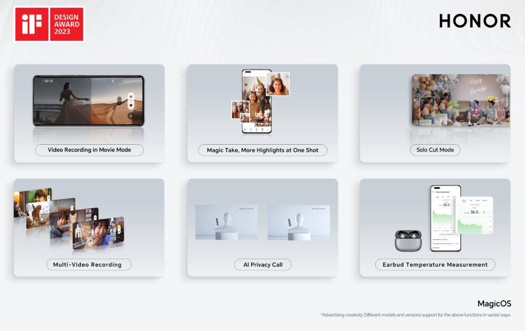 Globalni tehnološki brend HONOR objavio je da je dobio devet nagrada na prestižnoj iF Design Award 2023. Priznanja su dodeljena HONOR Magic Vs telefonu i karakteristikama kamere, uključujući video snimanje u filmskom režimu; Magic Take, More Highlights at One Shot; Solo Cut Mode; i Multi-Video snimanje. Prepoznate su i brojne druge HONOR funkcije, uključujući AI Privaci Call i Earbud Temperature Measurement, što naglašava veliku posvećenost kompanije dizajnu i inovacijama usmerenim ka čoveku.