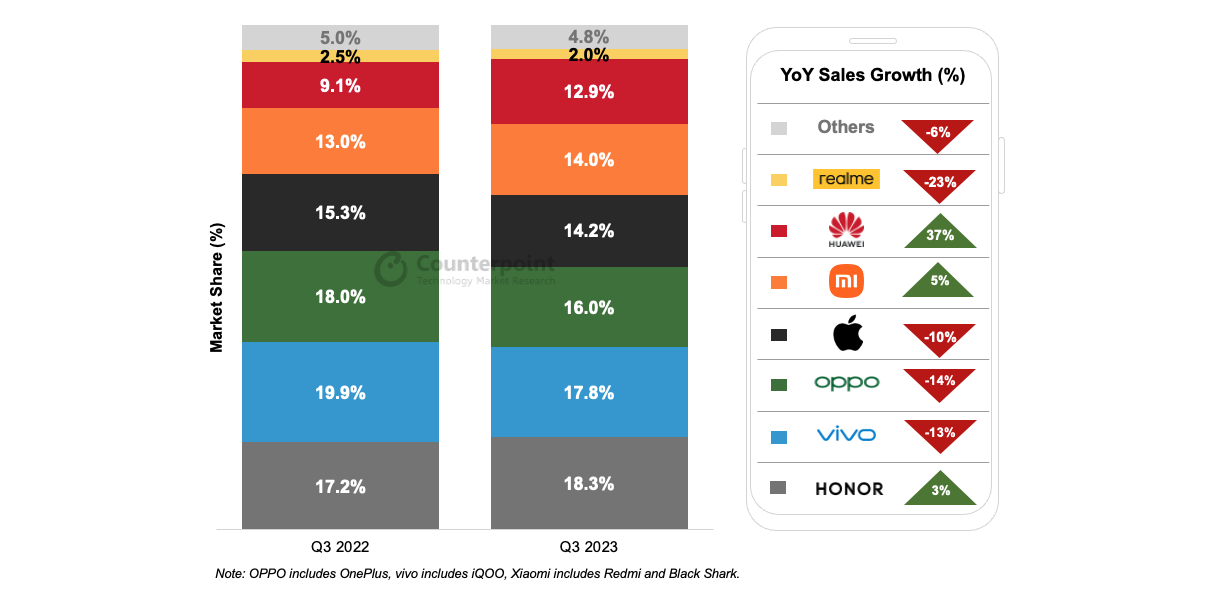 Kompanije Counterpoint, Canalys i IDC koje se bave istraživanjima na globalnom nivou, objavile su izveštaj o tržišnom udelu trećeg kvartala 2023. godine. Prema njihovom poslednjem izveštaju, kompanija HONOR u Kini se vratila na vodeću poziciju.