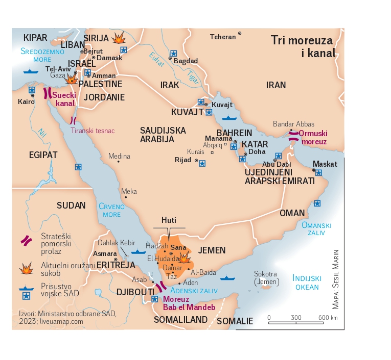 Od početka izraelske vojne intervencije u Gazi u znak odmazde za krvavi napad Hamasa 7. oktobra 2023, jemenski Huti – sledbenici zejdizma, jedne od tri glavne struje šiizma – pojačali su akcije destabilizacije pomorskog saobraćaja u Bab el Mandebu. Ovaj prolaz, dugačak 193 kilometra i širok 32 kilometra, koji na arapskom znači „vratena suza“, razdvaja Arabijsko poluostrvo od Roga Afrike i omogućava pristup Sueckom kanalu. Pobunjenici lansiraju rakete i bespilotne letelice naoružane eksplozivnim napravama na teretne brodove i tankere, a s vremena na vreme sprovode i helikopterske akcije kako bi uspostavili kontrolu. „Na taj način vršimo svoju versku, moralnu i humanitarnu dužnost podrške onima koji trpe nepravdu u Palestini i Gazi“, objašnjava Jahja Sarija, jedan od portparola Hutija.