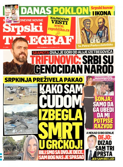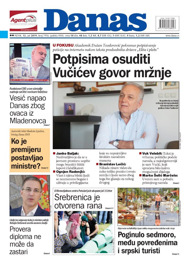INCIDENT NA PREDSTAVI O SREBRENICI – Dvadesetak osoba u majicama sa nacionalističkim simbolima i obrisima Kosova upalo je na izvođenje predstave “Srebrenica. Kad mi ubijeni ustanemo” u Kolarčevoj zadužbini, koju je organizovao Helsinški odbor za ljudska prava. Policija ih je posle verbalnog sukoba sa rediteljem i glumcima izvela napolje.