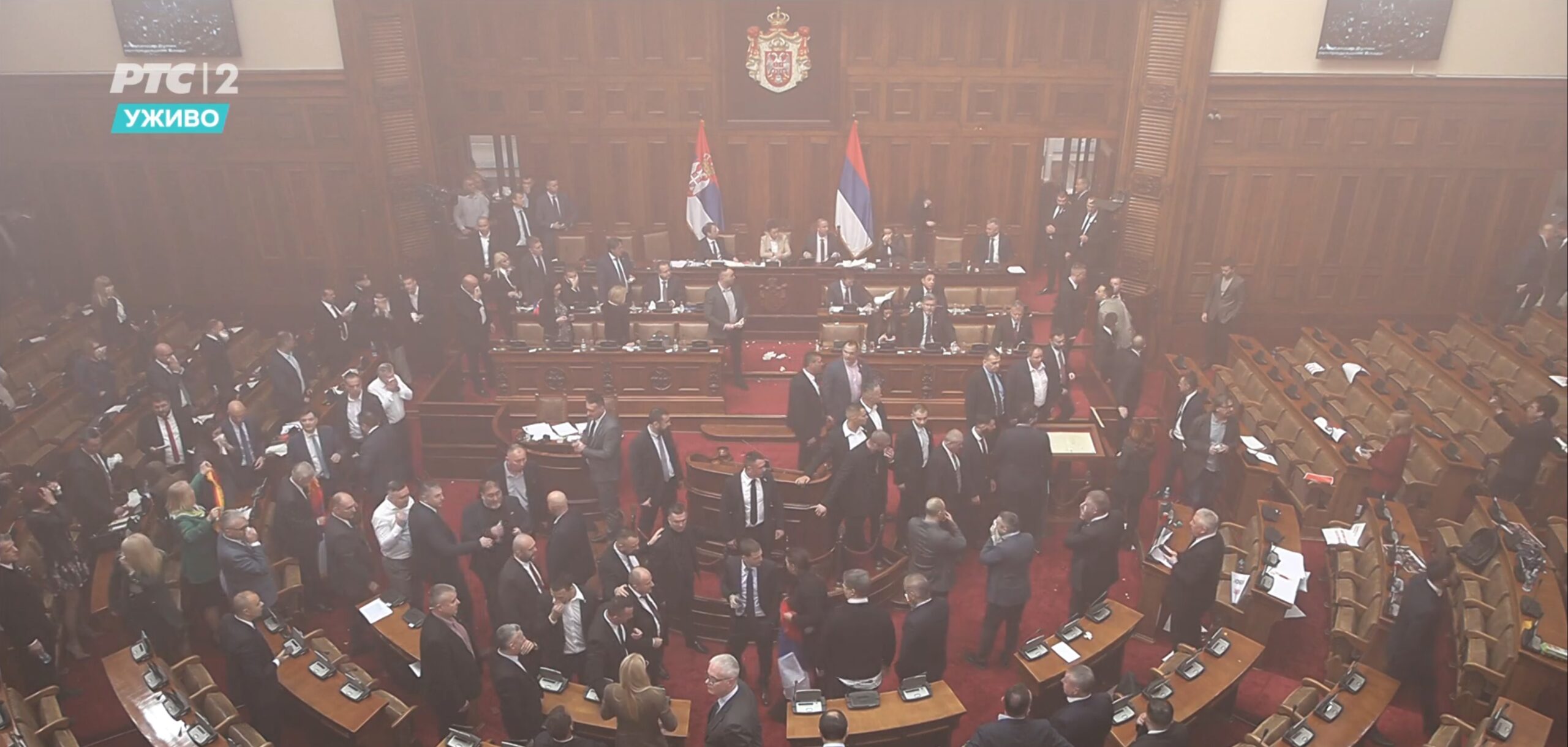 Opozicioni poslanici su tada napustili svoje klupe i krenuli prema stolu predsedavajućeg, nakon čega su upalili crvene i crne dimne bombe i raširili transparent na kojem se pisalo „Srbija ustaje da režim padne“.