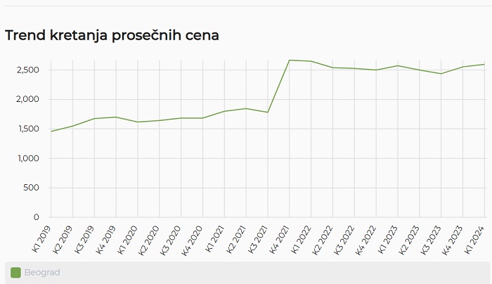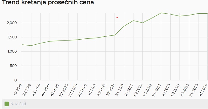Isti trend prisutan je i u Novom Sadu, gde je prosečan stan od 50 kvadrata pre pet godina koštao oko 67.750 evra, a prošle godine je za takvu nekretninu bilo potrebno oko 110.000 evra. Cena kvadrata je gotovo udvostručena – od 1.355 evra 2019. na 1.400 evra 2020. godine, potom na 1.500 evra 2021. a zatim na 2.000 evra 2022. i na kraju na 2.200 evra prošle godine.