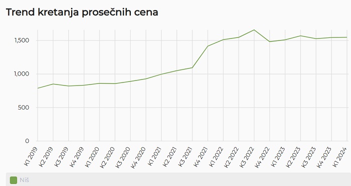 Za razliku od Beograda, prosečan kvadrat stana u Nišu je i prošle godine poskupeo. Iako ne kao prethodnih godina, ali je zabeležen rast sa 1.500 na 1.530 evra. To je zanemarljivo, ako se uporede podaci iz ranijeg perioda, kada je prosečan kvadrat sa 1.000 evra 2021. poskupeo na čak 1.500 evra u 2022. godini.