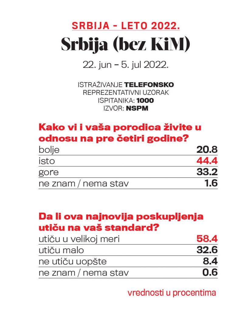 Između ostalog, prema ovom istraživanju, trećina ispitanika smatra da oni i njihove porodice žive gore nego pre četiri godine, oko 20 odsto smatra da žive bolje, dok je većini od 44 odsto – isto.