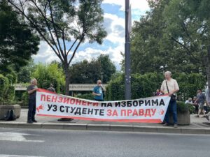 16:52.- Naš reporter Luka Lukić je uoči zanimljivu grupu penzionera kod JDP-a Nose transparent „Penzioneri na izborima uz studente“.