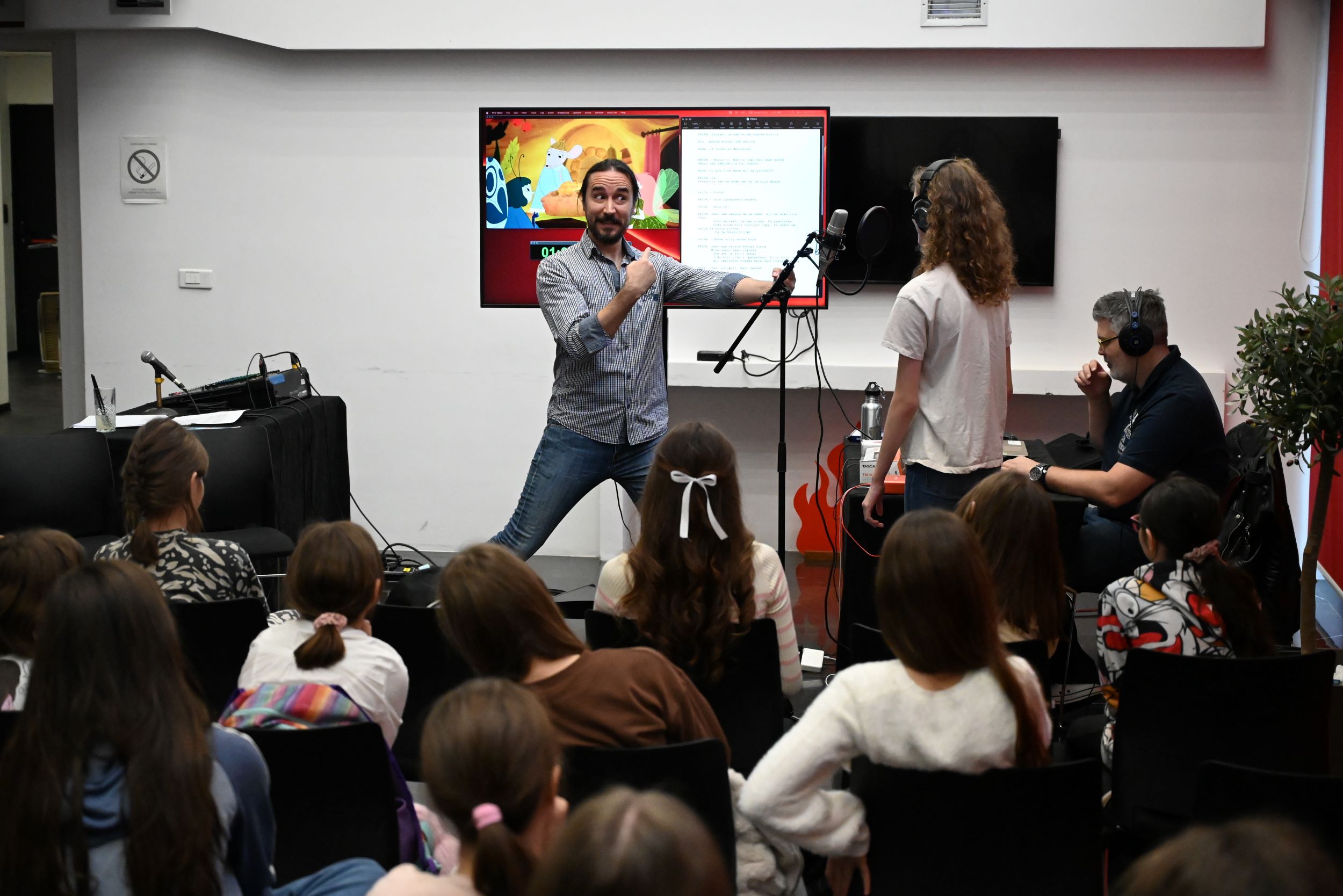 Radionice „Kako sinhronizovati animirani film“ vodili su iskusni glumci i filmski profesionalci Vesna Šašić Paštrović i Marko Marković, zajedno s inženjerom zvuka, Miletom Novkovićem.