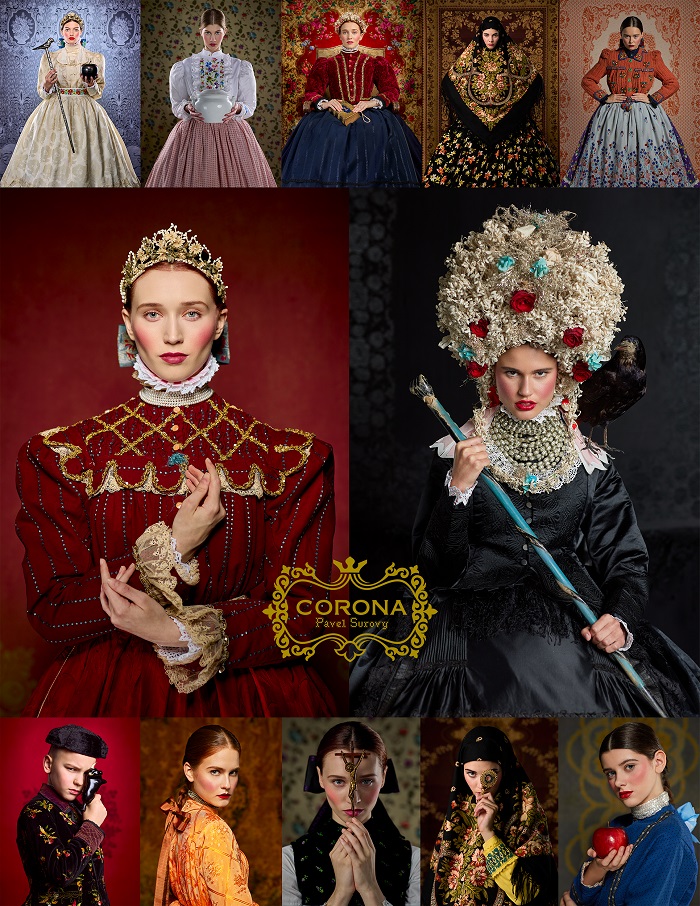 Sve fotografije iz „Corona–Kruna“ kolekcije ispričane su u alegorijama. U prvom planu dominira arhaična slovačka narodna nošnja. Drugi nivo su krune – oglavlja (prava oglavlja, ali i virtuelni oreoli, utkani na starim prekrivačima za krevete), a treći nivo je ezoterično-duhovna alhemija koja otkriva sublimiranu sakrivenu priču i istorijsku pravu ili imaginarnu ličnost unutar same fotografije. Sav umetnički scenario, scenografija, stajling, izbor ćilima i prekrivača, kombinacija nošnji, boja, sam čin fotografisanja i retuširanje, finalni rezultati projekta „Corona–Kruna“ plod su autora Pavela Surovog tj. njegove kreativnosti, imaginacije i duhovnih i filozofskih razmatranja događaja i ličnosti kroz istoriju čovečanstva.