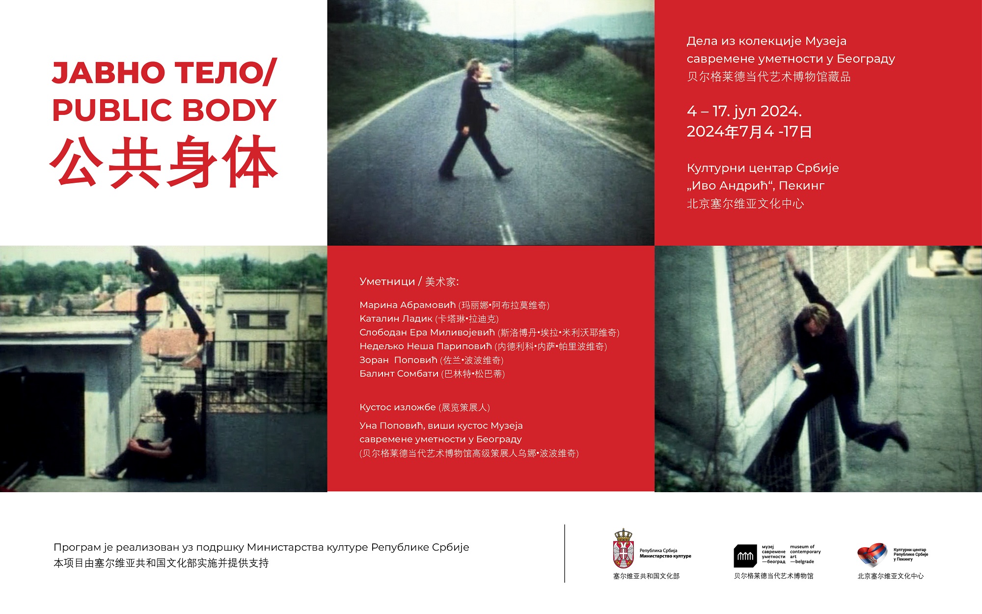 U četvrtak 4. jula u Kulturnom centru Srbije „Ivo Andrić“ u Pekingu, Muzej savremene umetnosti otvara izložbu „Javno telo“ s delima iz svoje kolekcije. Ova izložba fokusira se na prezentaciju performans akcija umetnika nove umetničke prakse koja se razvijala krajem šezdesetih i tokom sedamdesetih godina u Srbiji, paralelno uz svetske tokove konceptualne umetnosti. Biće predstavljeni radovi iz kolekcije MSU umetnica Marine Abramović i Katalin Ladik, i umetnika Slobodana Ere Milivojevića, Nedeljka Neše Paripovića, Zorana Popovića i Balinta Sombatija. Autorka izložbe je Una Popović, viša kustoskinja Muzeja savremene umetnosti u Beogradu.