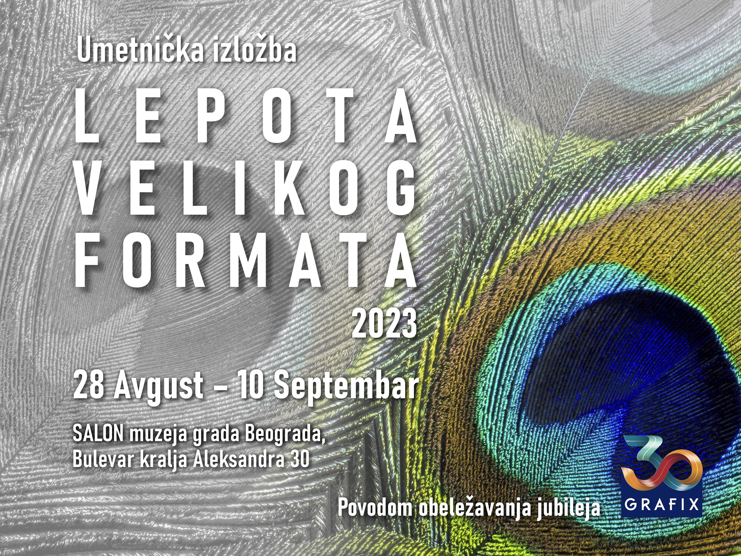 Izložba „Lepota velikog formata“ kojom kompanija GRAFIX obeležava 30 godina postojanja, biće otvorena za posetioce od 28. avgusta do 9. septembra 2023. godine u Salonu Muzeja grada Beograda (Bulevar kralja Aleksandra 30, Beograd).