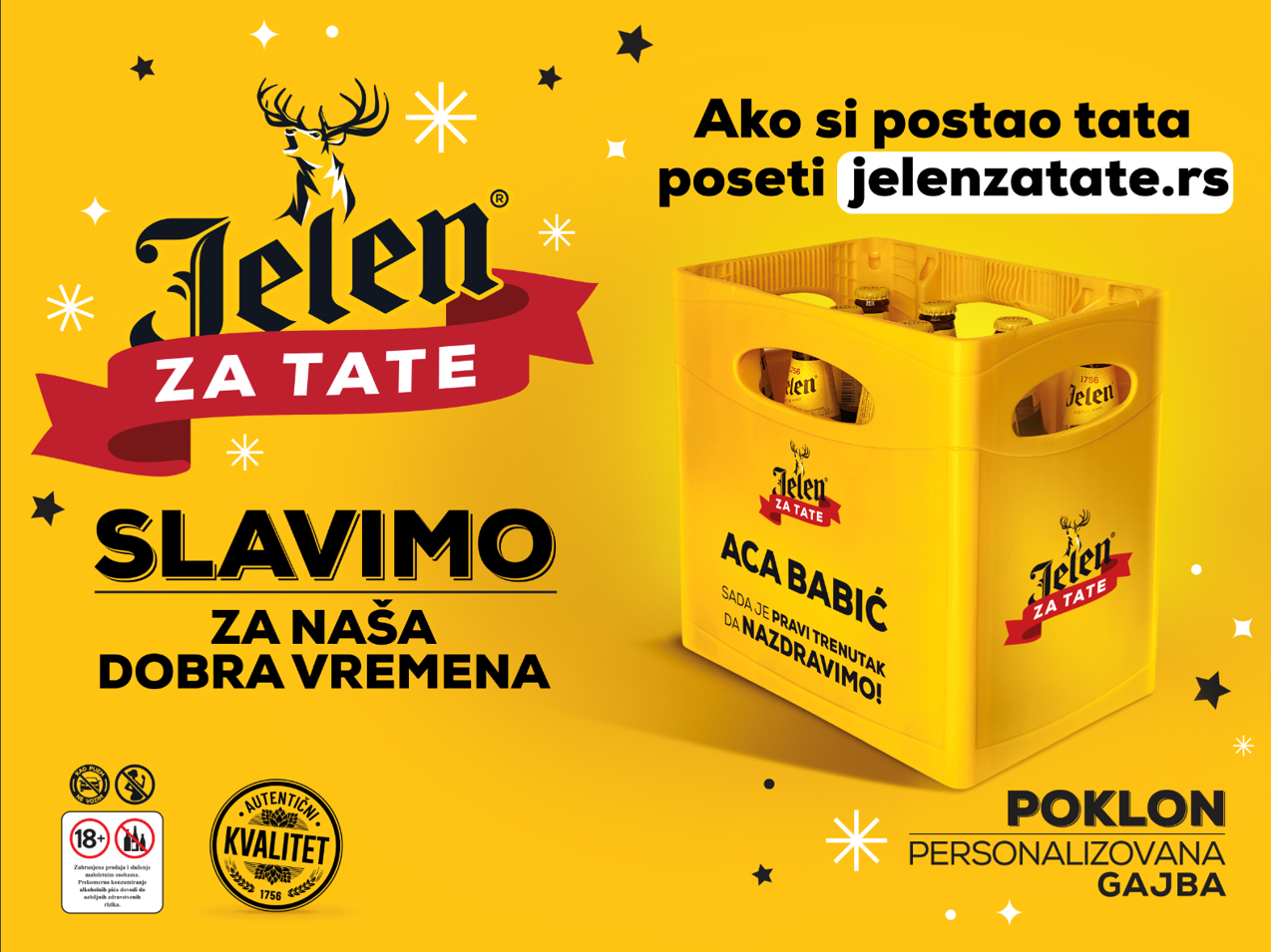 Zato je u sezoni proslava i praznika, Jelen pivo tu da ulepša specijalne trenutke opuštanja i zdravice koji posebno znače svakom novom roditelju. Svim tatama koji su se ostvarili u roditeljskoj ulozi, od oktobra ove godine, do januara 2023. godine, nakon što se prijave na linku https://www.jelenzatate.rs/ na kućnu adresu stići će unikatna i personalizovana gajba piva, posebno imenovana samo za njih. Ovim gestom Jelen na jedinstven način tatama želi da ulepša jedan od najvažnijih događaja u životu, ohrabri ih i da snagu da budu najveće podrške bebama i mamama.
