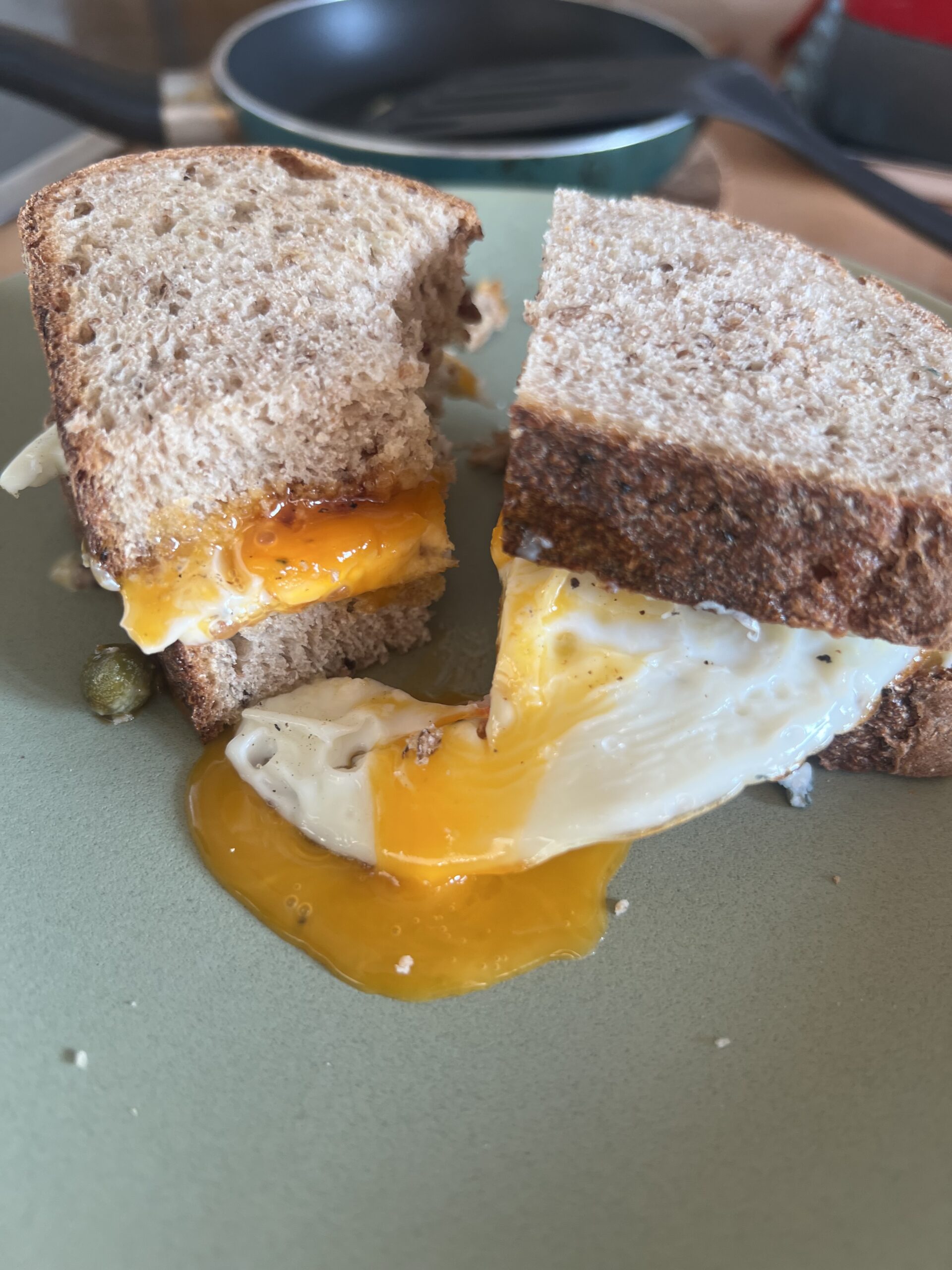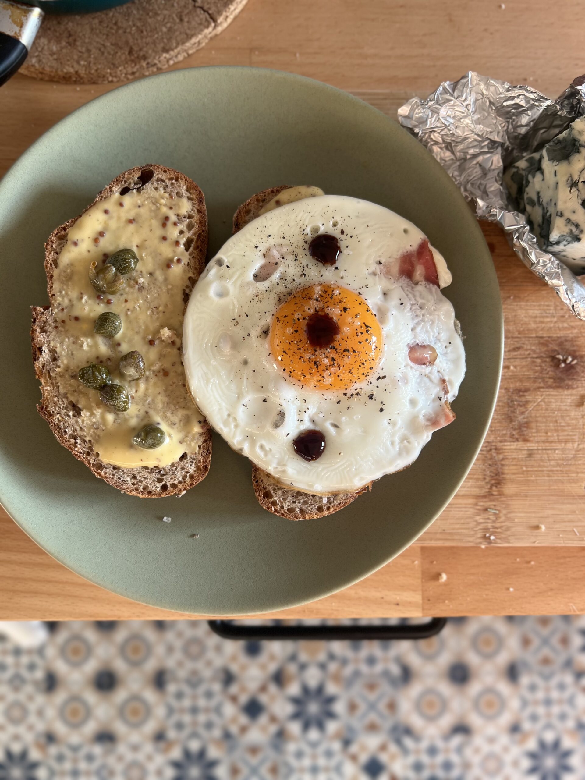 Koristite beskvasni hleb jer najbolje podnosi sve čime ćemo ga gastro-opteretiti do kraja recepta. Namažite ga ovlaš senfom sa semenkama i dodajte nekoliko kapara, te par kapljica balsamico kreme, koji sendviču daje preko potrebnu dozu umamija. Izmrvite plavi sir preko jajeta, tako da se polako topi od toplote. Najbolje stvari u životu su jednostavne, a đavo je u detaljima. A i đavo mora da doručkuje.
